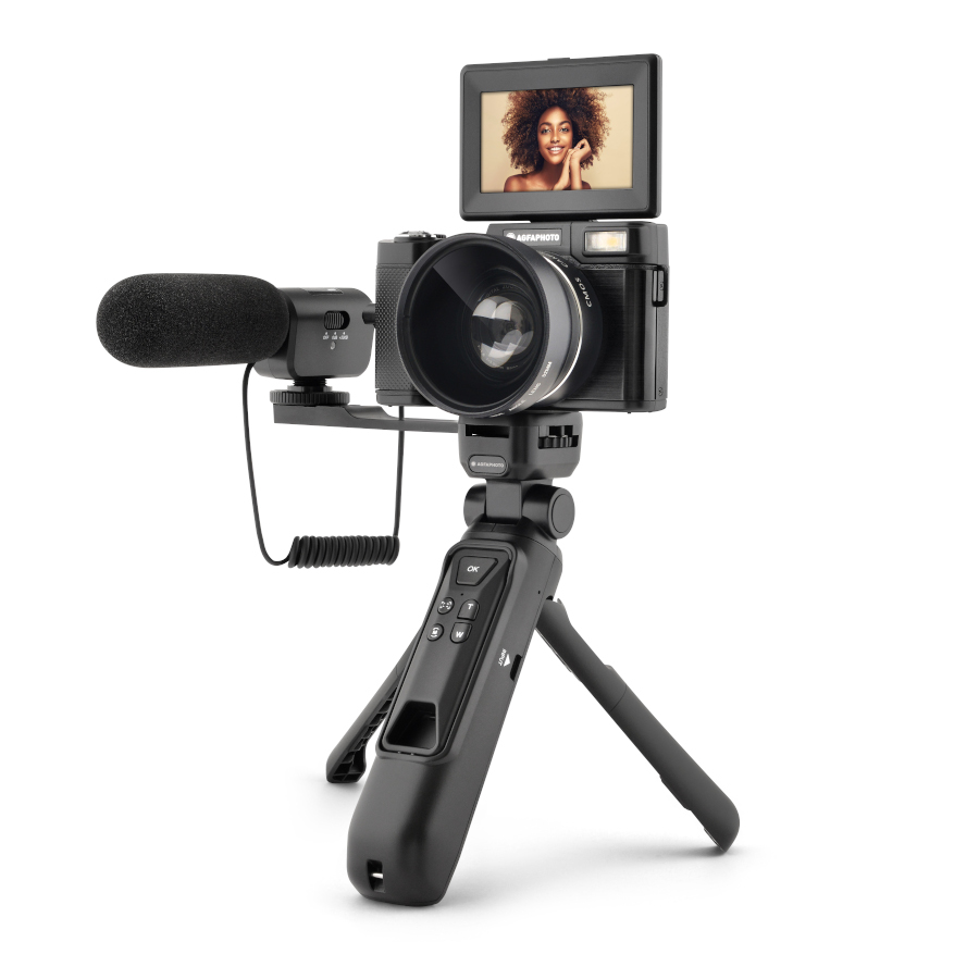 Camera VLG4KDIG, wide-angle lens, tripod with external battery, remote control, microphone, battery, shoulder strap, USB cable, wide-angle lens pouch, storage pouch