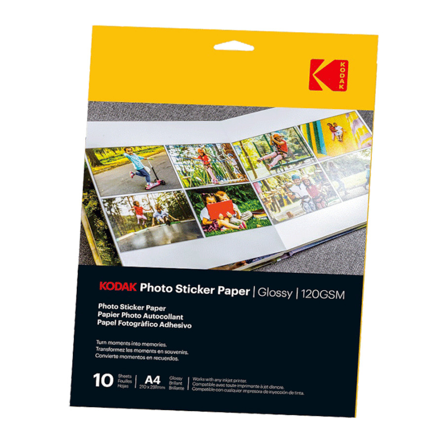 KODAK Photo Sticker Paper - 10 sheets of sticker photo paper pack - 21 x 29.7 cm format (A4) - Glossy finish - 120 gsm - Compatible with all inkjet printers.