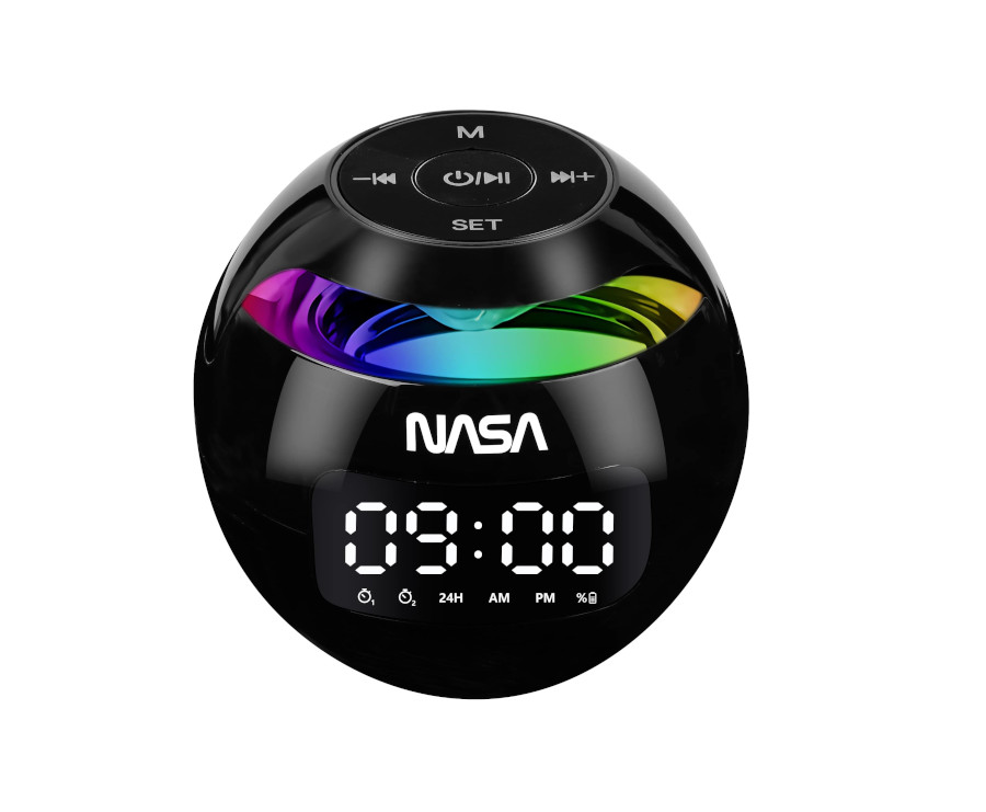Introducing our compact NASA SP200 Bluetooth speaker with impressive features. It has a powerful 3W speaker, a practical dual alarm clock, a long-lasting lithium battery, a built-in LED light, a USB-C charging cable and a micro memory card slot. Enhance your music experience with this versatile companion.